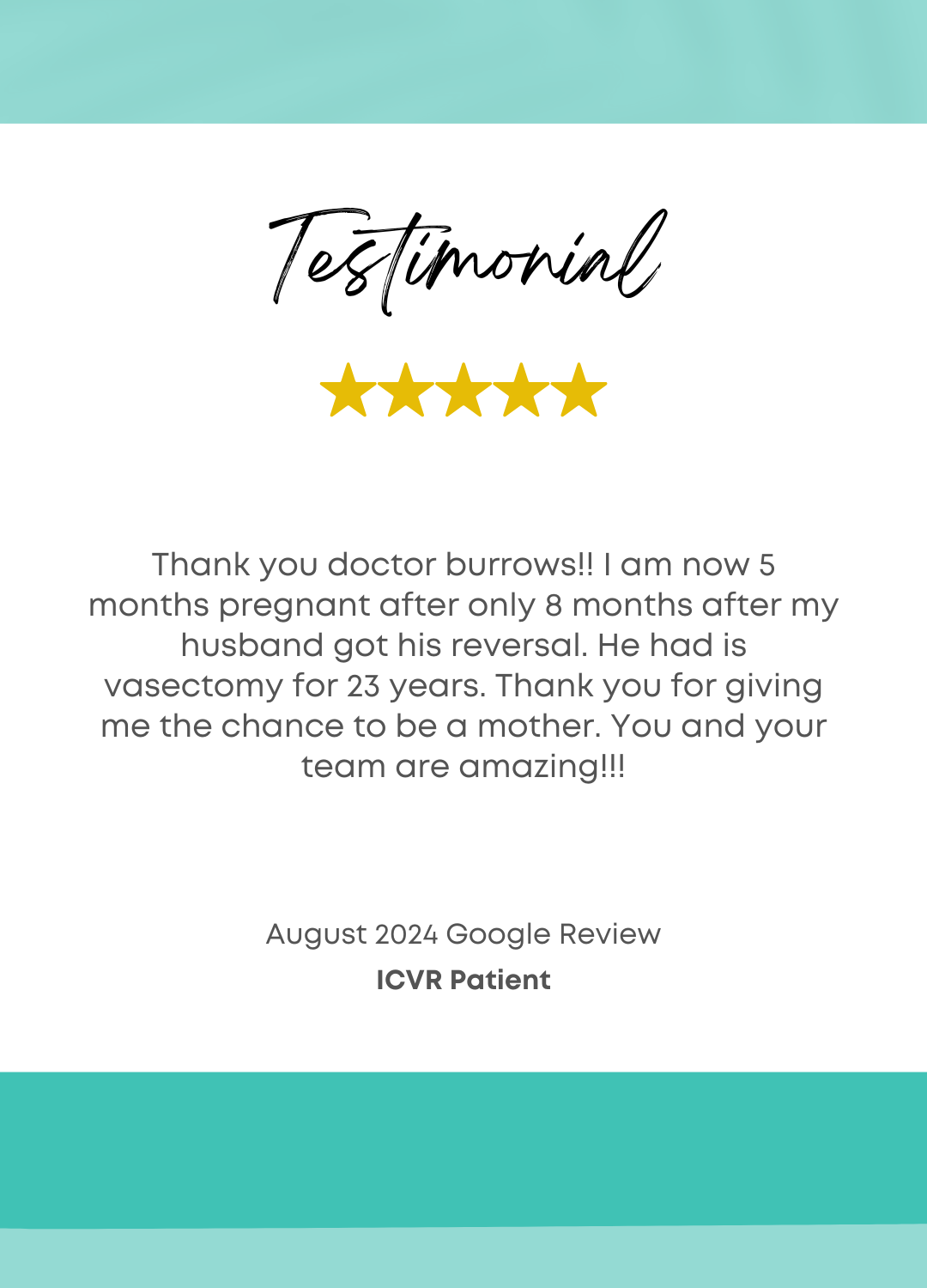 Many of our thousands of patients from Spokane, Olympia, Issaquah, Shoreline and throughout Washington choose ICVR because of our proven and published success up to 99.5% at our full-time, vas reversal only surgical center to get the highest chances to achieve the dream of having children after vasectomy.